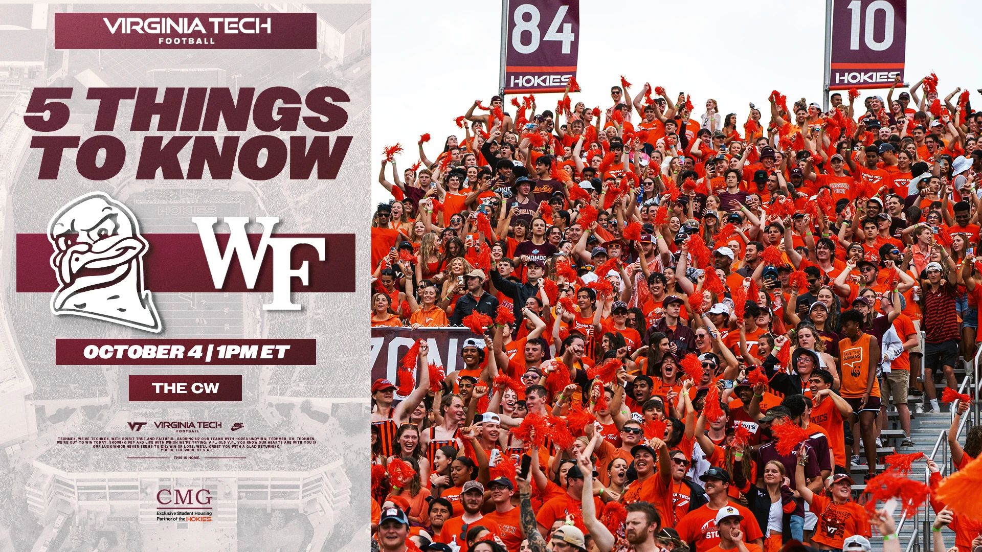 Next Up. The football team takes on Wake Forest at 1pm ET this Saturday. The game will be televised on The CW. This is the annual Homecoming game. Homecoming in Blacksburg dates back to 1926. We want everyone to wear orange to celebrate the USS Orange Effect in Lane Stadium. Hokie Village will open from 9:30am to 12:15pm. There will be food trucks, inflatables and live music.