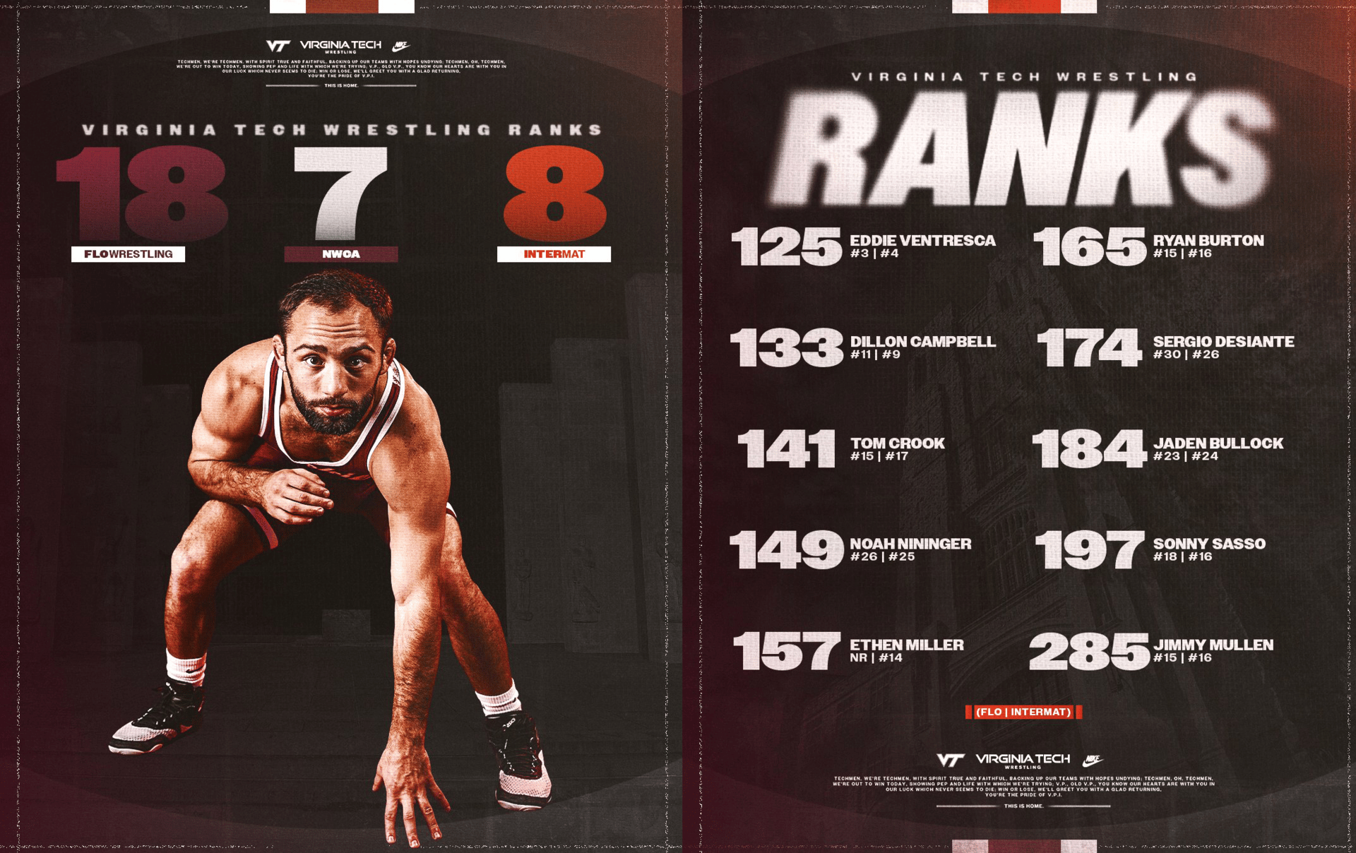 Additionally, all 10 Hokie wrestlers sit in the top-30 individual rankings, including Eddie Ventresca (#4) and Dillon Campbell (#9), who both rank in the top-10.