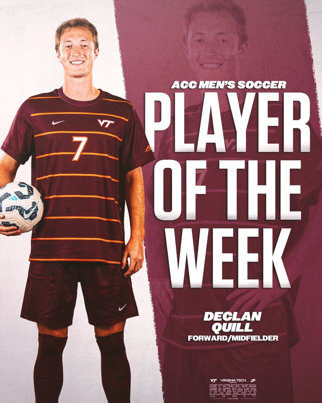 🔼 Anotha’ One. The ACC named Declan Quill the Offensive Player of the Week. This is his second weekly honor of the season. Quill totaled four points in the Hokies’ 3-3 tie against Clemson. He scored a goal and had two assists.