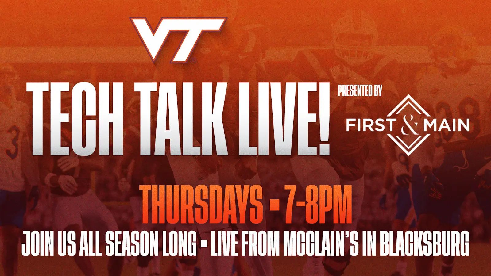 Join hosts Zach Mackey and Mike Burnop this Thursday, November 6 from 7pm to 8pm at McClains at First and Main for Tech Talk Live. Guests attending the show can also enter in a special gift card drawing, made possible by First and Main, the Preferred Entertainment Destination of Virginia Tech Athletics.